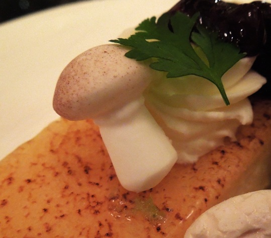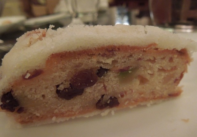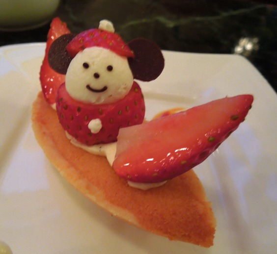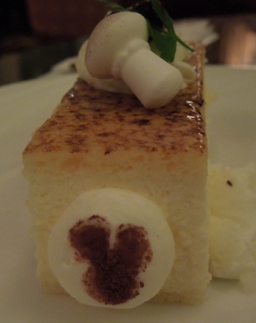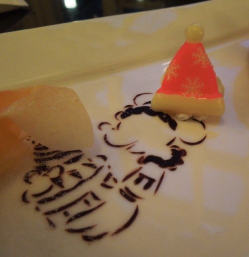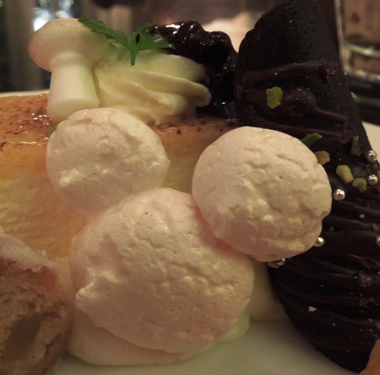 さて、デザートのプレートにはことさら感激です。シュトーレン2枚、ラングドシャーのツリー、ミッキーの顔の白いメレンゲ焼き菓子、ミッキーの手のパイ、フロマージュケーキが盛り合わせてありました。フロマージュケーキの横に生クリームにベリーソースでミッキーの顔マークが、きのこはマジパン製、ラングドシャーのツリーはオーナメントをアザランで作ってあるというもの。