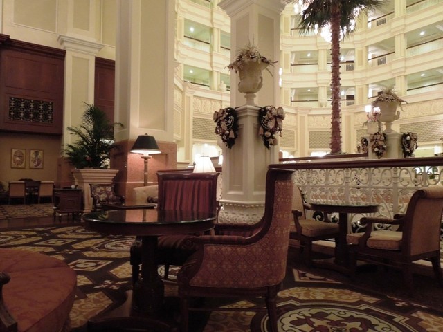 東京ディズニーランドホテルのロビー階にあるラウンジです。TDLのWEBサイトを見ていてクリスマス向けのセットが魅力的だと思い平日仕事帰りに行ってみました。JR舞浜駅を出て右側、ボンボヤージの先へ陸橋を歩いて7分ほどのところにあります。玄関前の庭でミッキーやグーフィーの形にカットされた植栽、ホテル外観などひとしきり写真を撮って、大階段を上がって店舗入口へ。