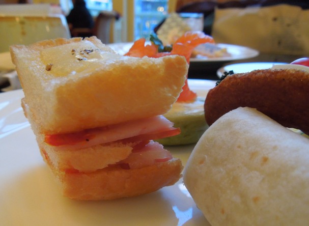 下段:サーモンのカナッペ、コールスローロールサンド、ハムサンド、
