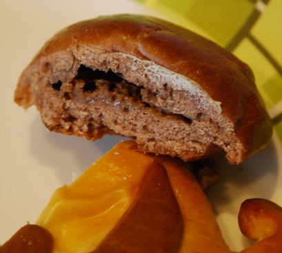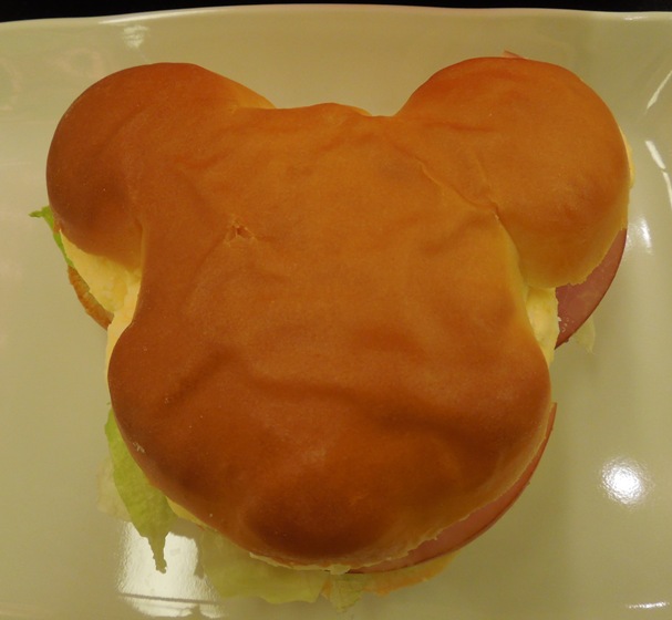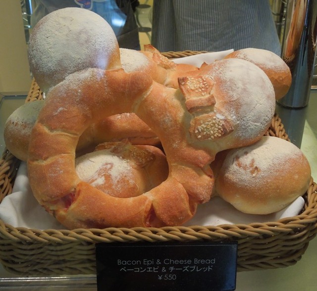 「ベーコンエピ&チーズブレッド」はとっても大きくて、ベーコン入りの部分とチーズ入りの部分があって、どちらもたっぷり具が入っていてCPがいいと思いました。耳にリボンっぽい飾りが白ゴマで作ってあったので、ミニーちゃんのイメージかしら?この大きさと味どちらも感激ものでした。
