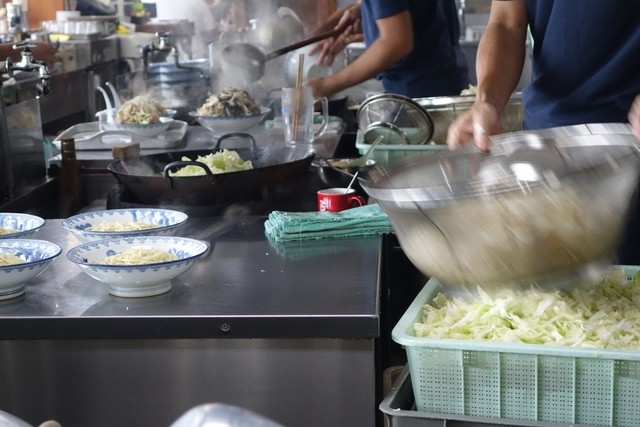 作るところを見ていたら、中華鍋に、油、胡麻油、豚肉、かまぼことさつま揚げ、玉ねぎ、キャベツ、もやしの順で入れていたかな?すごく手際がよくて、そして暑い中というか、熱い中、作られるのがとても大変そうなのに、一生懸命作っておられて本当に感心しました。それでいてスタッフの皆さん、いらっしゃいませ、ありがとうございます、など、とてもハキハキしていて接客も気持ちがいいんです。