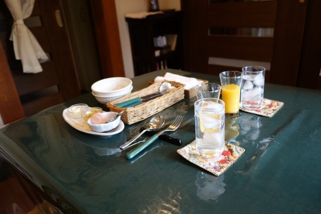 駐車場は宿の建物に向かって右側に2台分のスペースがあります。1Fが食堂で、2Fが客室です。客室は「ゆずりは」と「やまもも」の2つで、私たちは「やまもも」でした。ベッド、ソファ、畳スペースにこたつ、部屋専用の半露天風呂(洗い場とシャワー付)、専用ベランダ、トイレ、洗面所という構成。