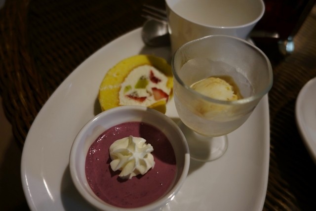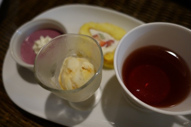 デザートは後ほどお部屋に持ってきていただくこともできるとのことで、しばらく経ってから届けていただきました。飲み物はハーブティをお願いして、デザートプレートは、ベリーのムース、フルーツのロールケーキ、キャラメルアイスのようなものだったかと思います。