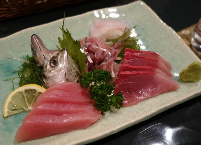 地魚お刺身盛り合わせ:めじまぐろ、寒ブリ、あじ、カワハギ。