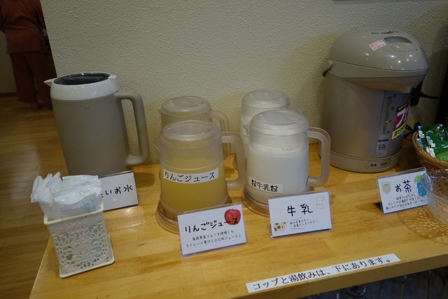 朝食はテーブルにセットされた手作りおかず+サラダ・ご飯・味噌汁・デザートなどのブッフェというものでした。ブッフェコーナーに当日あったものは、レタスやキャベツスライス、コーン、スライスオニオンのサラダ。カップのオレンジゼリー、納豆、海苔、小梅干し、水餃子の梅肉タレ、温泉玉子、白ごはん、もち米入り炊き込みご飯、りんごジュース、牛乳、水、温かいお茶(ティーバッグ)、デロンギコーヒーメーカーのコーヒーなど。
