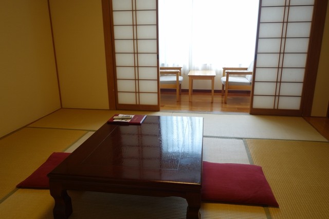 部屋は広縁と洗面台、空の冷蔵庫、トイレ付きの和室で、エアコンのクーラーはとてもよく効きました。川側の部屋で眺めは開けていましたが、川向こうの廃業した大型旅館2棟が見えるのだけが若干不気味でした。距離はかなりありますので、気にしなければ気ならないでしょうが。