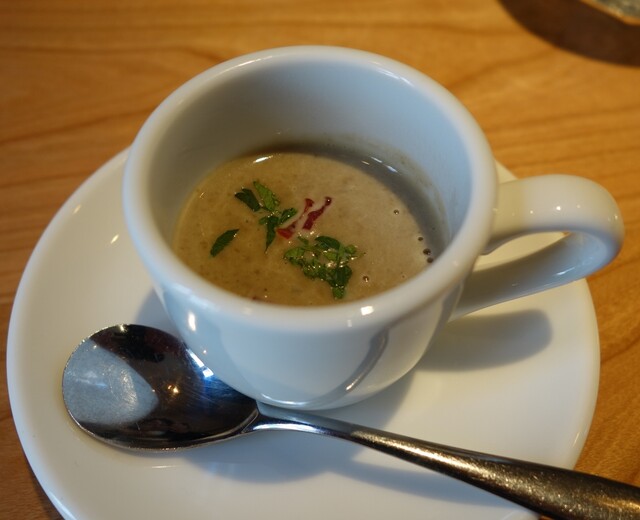 最初に供されたのはスープ。この日の素材はレンズ豆とマッシュルームだそうで、色は地味ながら、滋味あふれる味というか、しみじみと素材の良さを感じられる濃いスープでした。