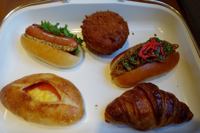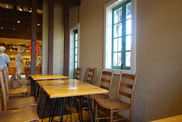 店に入ると、右側がトングとトレーでパンを選んで取るコーナーで、左奥が喫茶コーナー。イートインする場合の席は、先に取ってもいいし、買ってから着席するのでもいいそうです。2名で訪問し、私たちは念のためにタオルハンカチをテーブルに置いて席確保を先にしました。