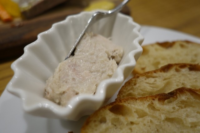 ここでドリンクは、私は「泡」を、同行者は「白ワイン」を選びました。おつまみは「豚のリエット」と「パテドカンパーニュハーフ」を選択。「豚のリエット」には薄切りのパンが別料金じゃなくてちゃんと添えられているし、「パテドカンパーニュハーフ」には自家製ピクルスが彩良く添えられていて、味の良さだけでなく見た目やCPの良さも大満足。