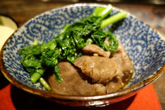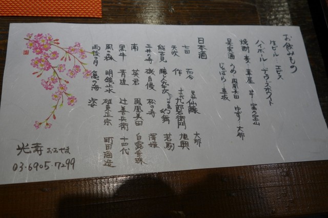 電話で予約していた通り「おまかせコース」(8,000円)を。お料理が季節の小鉢、肴、すきやき、ご飯、デザートなど全部で15品ほど。飲み物は光壽限定酒を含めて30種類ぐらいの日本酒をはじめ、エビス、ハイボール、焼酎、果実酒などが飲み放題。