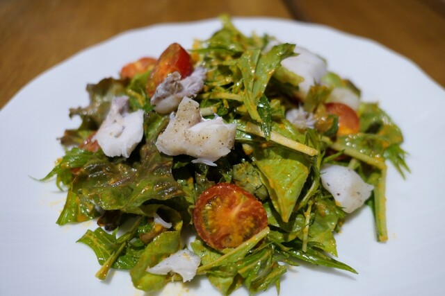コースのサラダは「カタルーニャ風」にアップグレードしてもらいました。ソースはアーモンド、パプリカ、魚はタラだそうです。