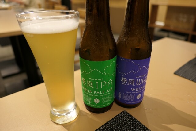 地元のクラフトビール(イシノマキ・ファーム)「巻風エール」(800円)×2種で乾杯。クラフトビールにはあまり興味のない同行者がこれは美味しいと絶賛していました。そのあとはドリンクは「ペアリング」(5,000円)×2人分でお願いしました。