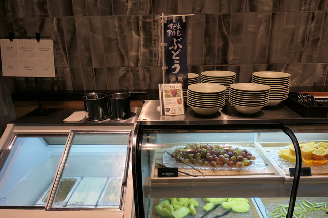 他にも特徴的なのが、すき焼き、鯛出汁に切り身のラーメン、広島サーモン、あなごごはん、シーフードマルシェ、ローストビーフ、府中みそプリンなど。シーフードマルシェにはタコのカルパチョもあってこれが実に美味しかったです。朝食ブッフェに日本酒があるのも初めてでした。味はそれほど好みではなかったですが、ちょっといただきました。