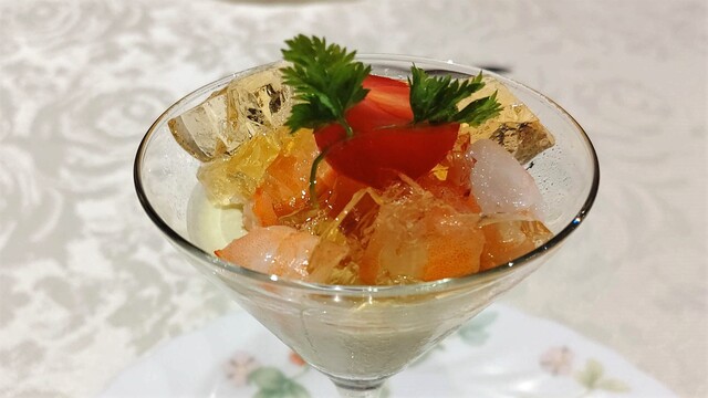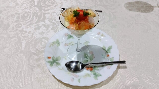最初の一品は「グリーンアスパラのムースと天使の海老のゼリー寄せ」です。カクテルグラスの下層にムースが、その上に海老とコンソメのゼリーが盛られ、ミニトマトとイタリアンパセリがトッピングされています。