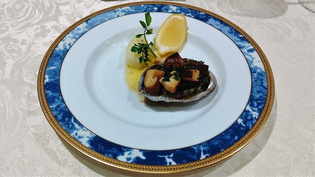 鮑の身は淡泊な風味でバターの風味が勝るが、肝の部分には濃厚な風味を持ち、鼻孔いっぱいに磯の香りが広がります。バターとレモンの相性の良さを再認識しました。