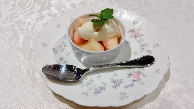 デザートは「和歌山県産 桃のパルフェ」です。ムースとゼリーを下層にして、その上に桃とバニラアイスが盛られ、ミントが乗せられています。この桃が実に甘い。旬のものはいいですね。