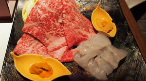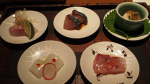 先附と八寸が同時に運ばれてきました。先附は阿蘇赤牛、自家製カッテージチーズ、さくら肉です。