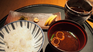 肥後米と南関揚のお味噌汁です。ふわふわした南関揚は軽い口当たりです。