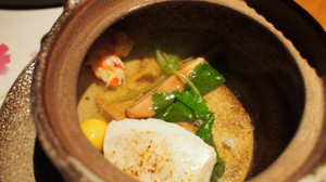 八寸は帆立みぞれ和え、鶏香煎、卵黄味噌漬け、黒豆松葉刺し、とこぶし旨煮、すずき南蛮、小芋八方煮、蛸やわらか煮がそれぞれ美しく並んでいます。
