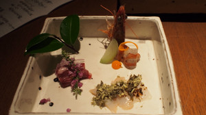 造里は「八の幸・八の味」と題された、8種の素材をそれぞれ特徴的に手が加えられています。車海老は卵黄の味噌漬けと、桜肉トロは高菜・梅肉と、つぶ貝は山葵・塩昆布・おぼろ昆布。鯛は酢橘、塩と、関鯖は納豆醤油と、鮑は柚子ポン酢と、烏賊は赤柚子胡椒・アボカドオイル、勘八は酒盗正油。