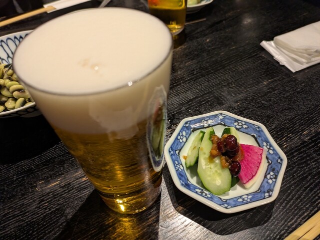 お通しは胡瓜・しょうゆ豆・紅芯大根。