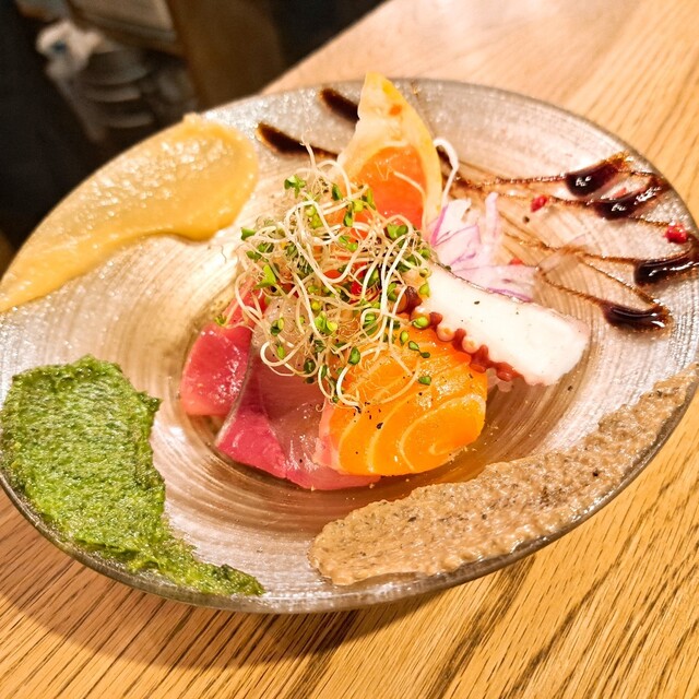 お刺身のカルパッチョは、なんと四種類のソースでいただきます。
