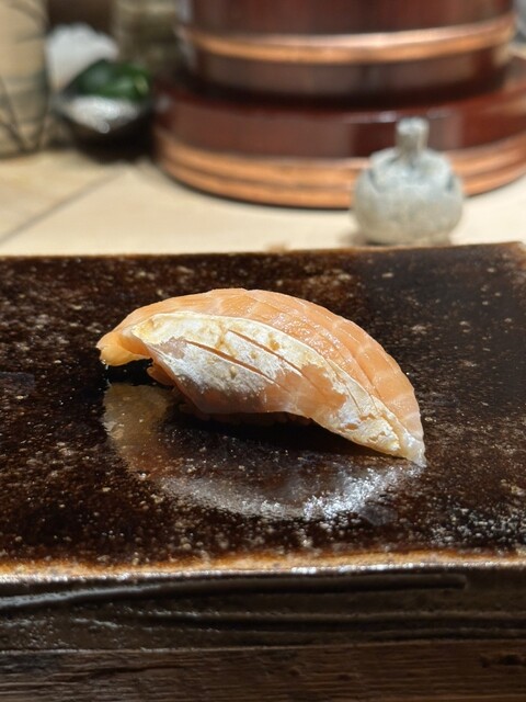 砂糖〆をしているようで個人的な感想ですが軽くスモークしているようなトラウトサーモンのような味 腹の部分だったからか脂味もかんじつつくどく無く臭みもない美味しさ