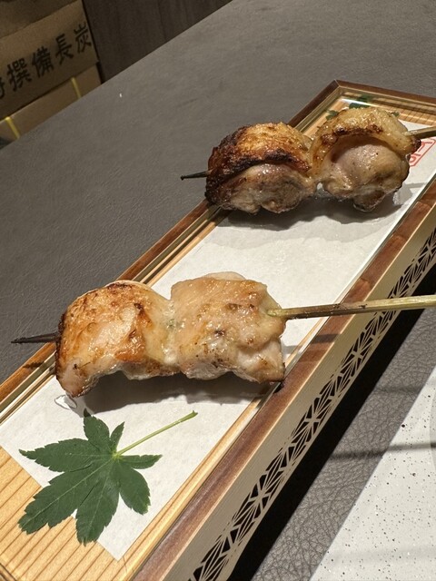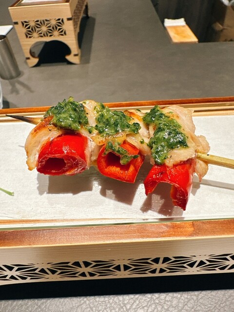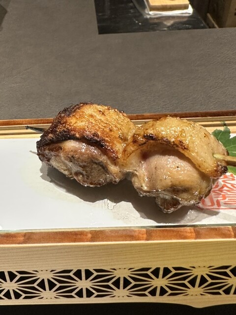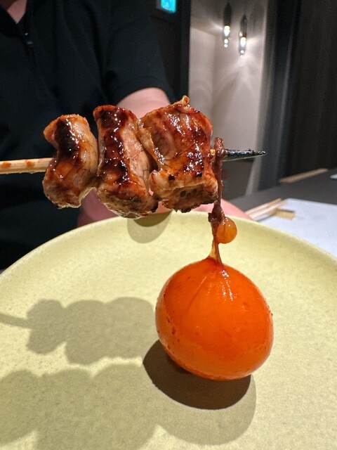 茶碗蒸しの様な器が先ず提供されその後にズッキーニを纏った近江鴨の串が提供される 蓋を開けるとそこには綺麗な黄色の奥久慈卵とタレ。 たっぷりとその黄身に絡めながら食べます口の中が幸せ一杯になります 相方ちゃんは卵黄に米落として食べたいとおっしゃってました(笑)