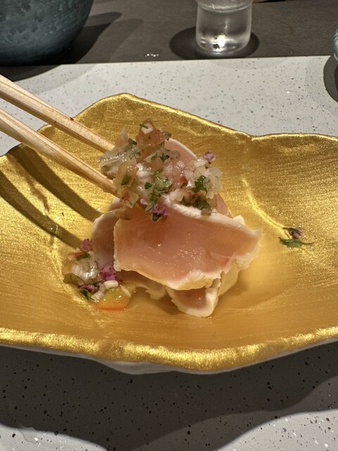 霜降りささみを南蛮酢に漬け様々な薬味を細かく刻んだものが酢とささみの味の締まりをぎゅっと締めてくれてますさっぱりとしていて鶏の良い脂がより浄化された気持ちになる