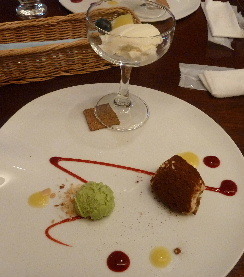左手前がピスタチオで作ったジェラート、右手前がベネチア風ティラミスで、生クリームでなく卵白を使っているとのことです。奥がパンナコッタです。