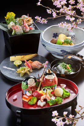 前菜は、見た目もすばらしく、ペアのおひな様の容器もありました(写真にも写っています)。その中にも料理が入っていました。こんな容器を出すというだけでも大変です。この容器は3月にしか使えないでしょう。しかも、店内に複数の部屋があることを考慮すると、同じ容器をたとえば30個くらい揃えておかないといけません。そういうことができるというだけで店のレベルをうかがい知ることができます。