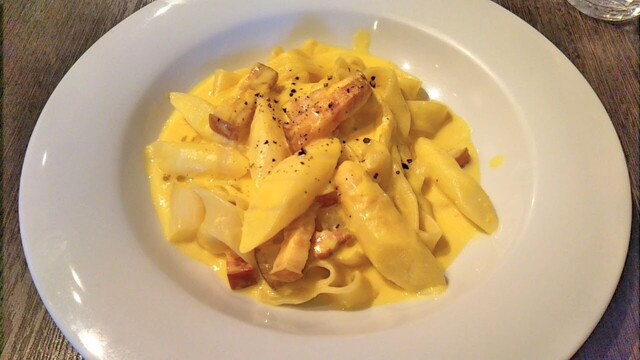 ホワイトアスパラと厚切りベーコンのカルボナーラ。