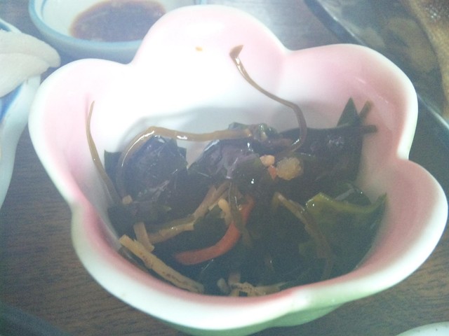 刺身が7種類 ご飯とアサリ汁とお漬物 のりの佃煮 昆布とワカメの和え物