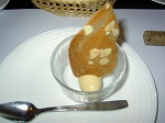 これにパンがついて、あとはデザートで「キャラメルアイスのラングドシャ添え」が出て来ました。舌触りが超滑らかで美味しい!!(‐^▽^‐)でも「デザート少ないよなあ。。」と思っていたらシェフの方が来て「本日のデザートをケーキ2種類からお選びください」とケーキを二種類持ってきてくれました。「すっげーデザート二品だーヽ(=´▽`=)ノ☆」と途端にテンション上がる単純女yucat(笑)ベリーとアーモンドのタルトも美味しそうだったのですが、五分悩んで、「バナナと洋ナシのケーキ」を選択。オレンジのシャーベット、レモンムース、チョコ、ラズベリーがついてきてメチャ豪華でした。多分一回にキャラメルアイスとケーキが出てきたら感動も薄かったと思うのですが、ニクイ演出です(*`▽´*)(笑)