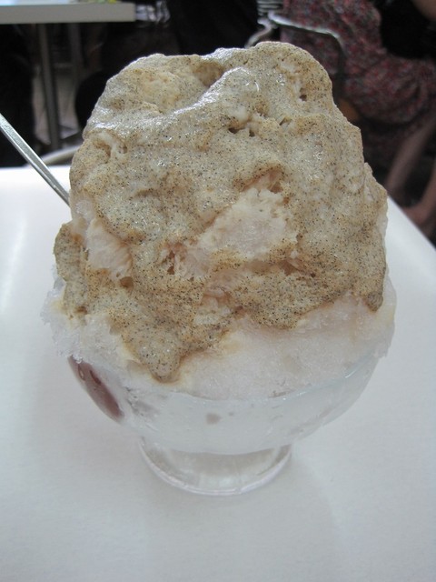 今回は贅沢にも1番高い「氷きな粉金時ソフト」に「硬めプリン」と「黒胡麻ソース」トッピングで(^^)まあ、、贅沢言うても500円位やけどなw