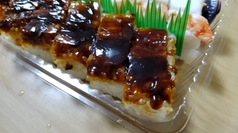 そして穴子箱+海老箱です。こちらの穴子箱は穴子がしっかり焼かれており蒲焼き状態のホロホロ感が素晴らしいですね。ツメは上穴子にぎりと違って甘みが強く感じました。海老箱は普通です。もう少しジューシー感が欲しいけど箱寿司独特の堅さですね。
