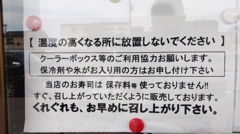 夏場はクーラーボックス持参が宜しいかと思います。保冷剤も入れてくれますが保存料を使っていないので出来るだけ早めに食べる為にも安全に持ち帰りたいですね。