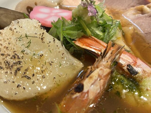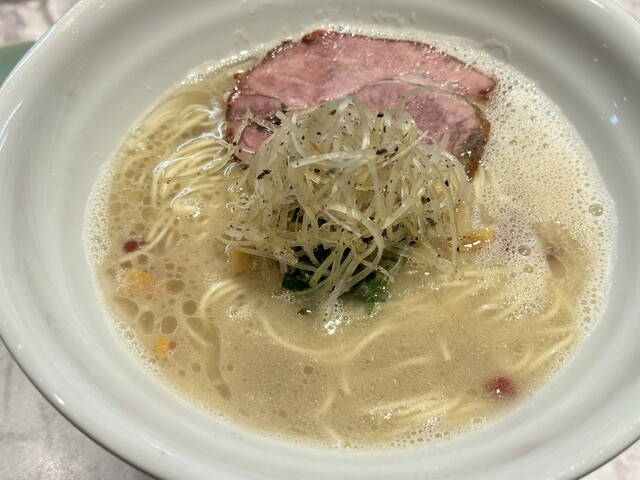 限定の「とんこつラーメン」は塩か醤油が選べて、替え玉が一つ無料で付いてきます。shizuku らしく、ハーブや野菜など様々なアイテムが入っていて、最後まで味の変化が楽しめます。アイテムにはそれぞれ丁寧...