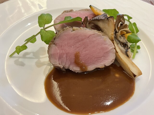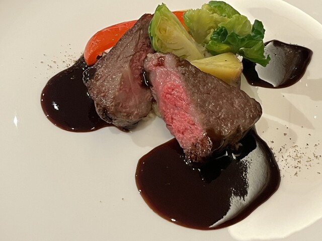 肉の断面に鮮やかな赤が残り、表面には美しいキャラメリゼが施された完璧なロティである。中心温の均一さが火入れの精度を物語り、フィレ肉の柔らかな旨味を損なうことなく引き出していた。シャンピニョンとピスタチオのヴィエノワーズは、香りの深さとナッツの油分が重なり、肉の旨味に奥行きを与えている。ボルドー風赤ワインソースは艶やかで、過度な重さを排しながら果実味とタンニンを優雅に残し、肉との一体感を高めていた。肉・香りの衣・ソースが三位一体を成す構成は非常に完成度が高いと思う。
