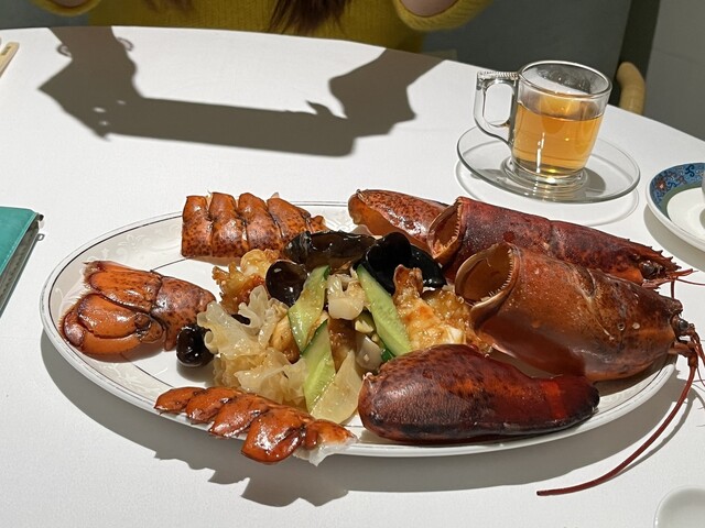 続くオマール海老の甘酢炒めは、まず提供時のプレゼンテーションが印象的でした。香ばしく揚げられたオマール海老は、山葱や大蒜を加えた油ベースのソースでまとめられ、そこにごく控えめな酢が加えられています。甘酢と呼ばれながらも、甘味や酸味が前に出ることはなく、あくまで甲殻類の香りと旨味を引き立てていました。西洋の高級食材を中華の文法に収める技術の確かさを感じました。