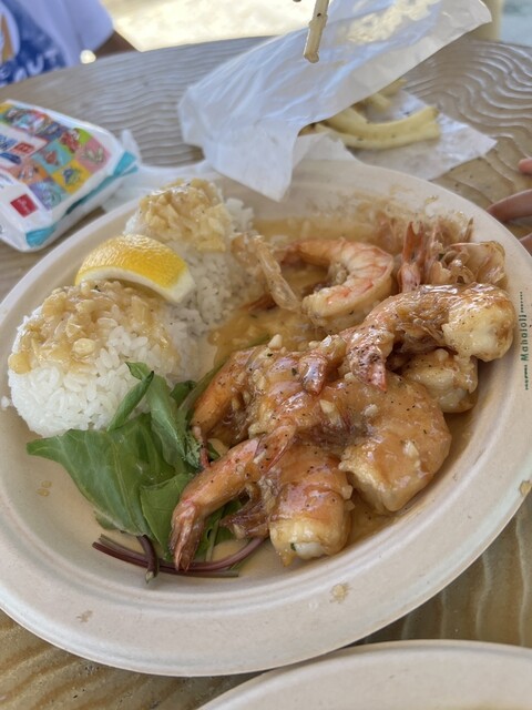 宮古に来たら必ず訪問すべきガーリックシュリンプの聖地。プレーン、濃厚バターガーリック、スパイシー、スペシャルの4種類。あとフライドポテトも絶品。飲み物はパイナップルアイスティ。
