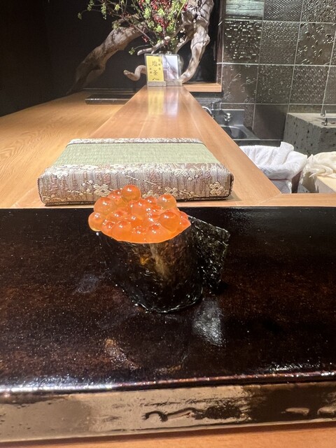手出しは鮑の肝ソース和え(とこぶしかな?)いきなりパンチあって美味しい。太刀魚の炙りを軍艦で。炙りというか焦がし。炭状の棒で直接ネタに焼きを入れ、芳ばしい香りを纏いながら手渡しで、美味しい。茶碗蒸しを挟んで、鯨のレバー。ごま油の風味で牛の生レバー