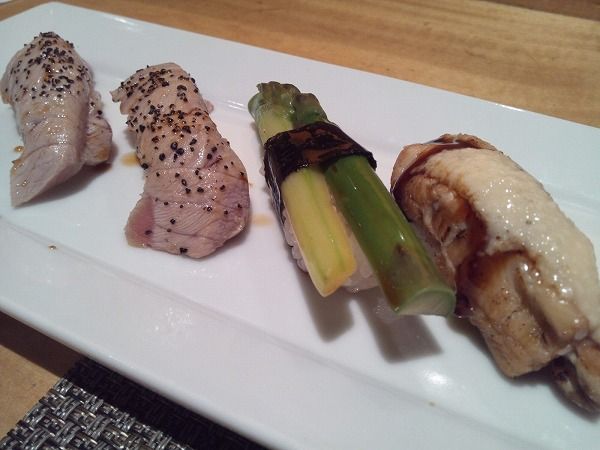 アスパラ、あなご山芋かけ、なにかのきのこ?を注文。