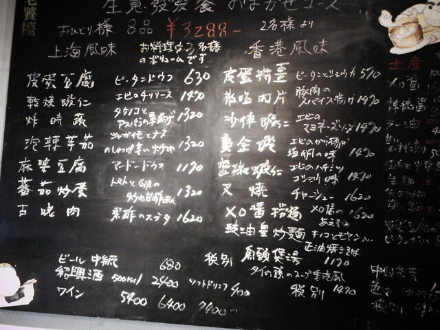 料理は黒板に多彩な名前が掲載されている。やはり、お任せ8品(3288円)が断然おとく。他の有名店なら2倍以上は取られるだろう。ただ、これだけは食べたいと指定すれば。森田さんが調整してくれる。オススメは海老の唐揚げ・塩卵、黒酢酢豚、叉焼など。