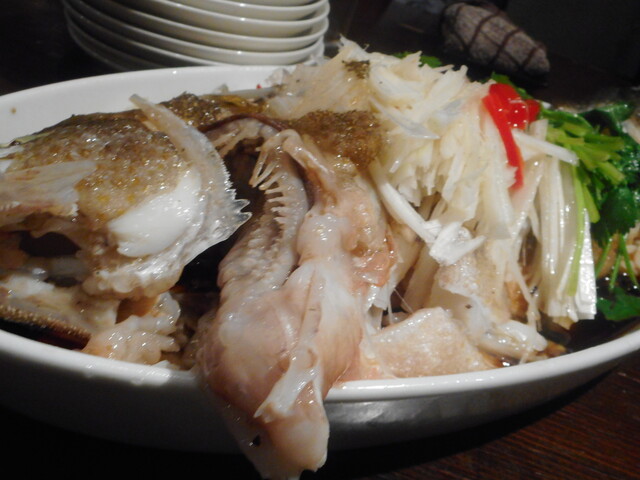 赤ハタの蒸しもの。もちろん頭と尾は一番美味でシェア。また汁は白飯にかけて。