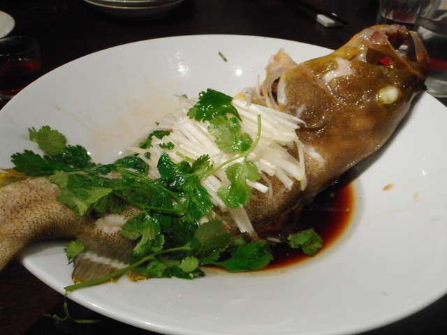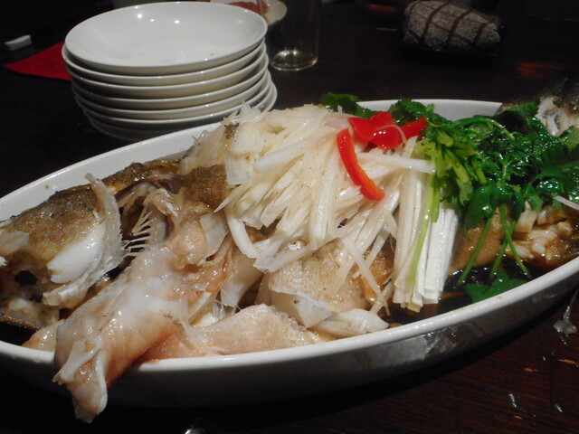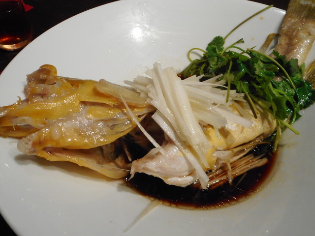 清蒸石斑。広東料理の中でももっとも人気のある一皿。日本人にはアワビ、フカヒレなどが知られているが。実際にはこの、日本で言うハタ科の魚の蒸し料理。これが広東料理のメイン。香港では一番美味しいと言われ。誰もが食べたい料理となっている。