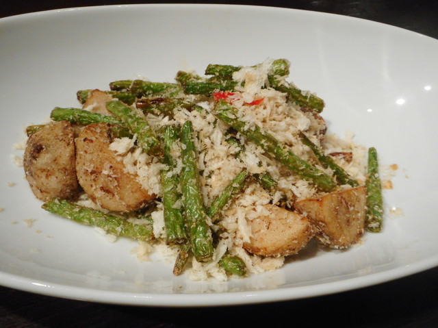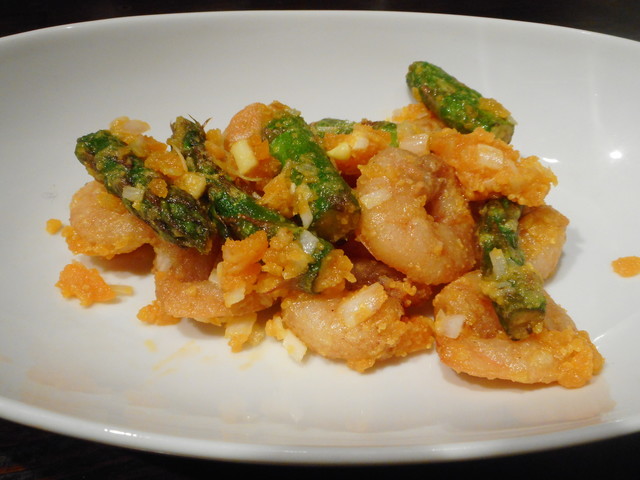 ●海老唐揚げ塩卵和え、アスパラガスも