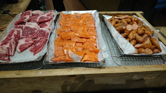 ステーキ肉、ロブスター、エビ、牡蠣、サーモンなど、自分の好きな物を皿に取りコックさんに差し出し、引き換えの番号カードをもらい、出来上がりの頃合いに取りに行くというシステム。