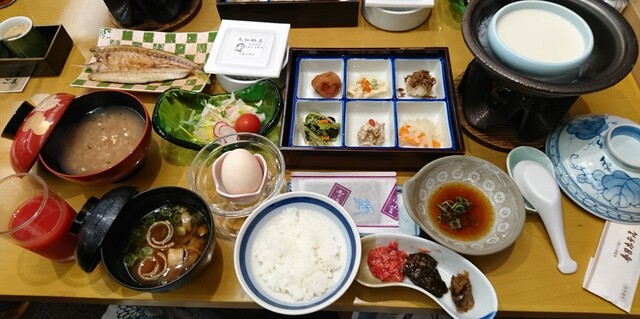 朝食も温豆腐や焼き魚をはじめ沢山の惣菜が並ぶヘルシーで華やかな和定食。