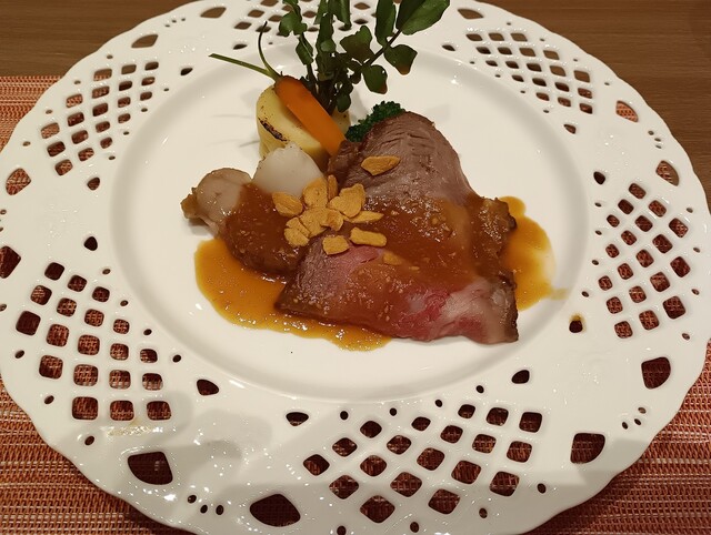 また「蝦夷鹿のロースト苺ソース」は牛フィレ肉のように柔らかくてジューシー、甘酸っぱい苺のソースとの相性も抜群で風味豊かなフレンチのジビエ料理でした。
